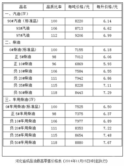 1月15日0时起,河北93号汽油最高限价调整为6.62元/升,降幅0.15元;90号汽油最高零售价格由6.28元/升降至6.14元/升,降幅0.14元。